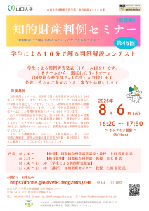 ●開催趣旨 知財判例セミナーは、初学者(例:法学部以外の大学生)も対象として設定し、また、オンラインで行うことで、日本全国からの参加を可能としています。そして、2020年以来継続的に開催し、今回が第45回となります。そこで、今回は夏企画として、学生チームによる判例研究発表(1チーム10分)を行います。 山口大学国際総合科学部では、2019年以来、知的財産法の授業の中で、1チームそれぞれ裁判例を選択し、研究を行い、発表するというスタイルを実施してきています。履修学生は、毎年約100名で、合計18チームに分かれて、前期最終週に判例研究発表を行っています。 今回、この講義参加チームから3~5組を選出し、各チームの判例の理解度、説明の明確さ及び考察力を競う場を設定し、皆さんに審査・コメントをしていただければと考えております。