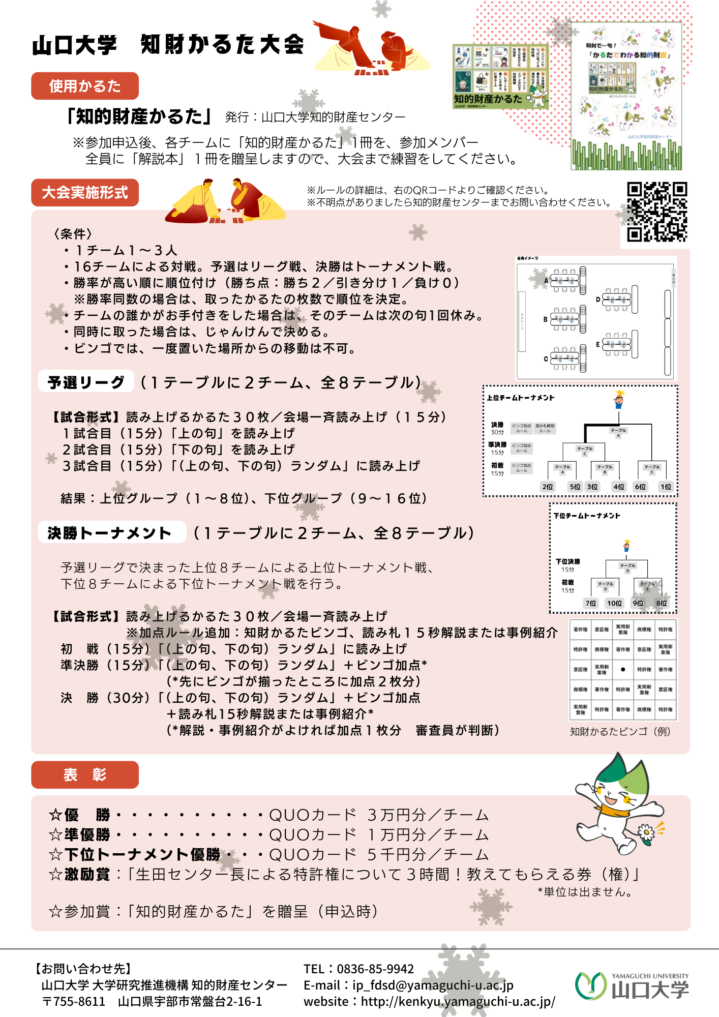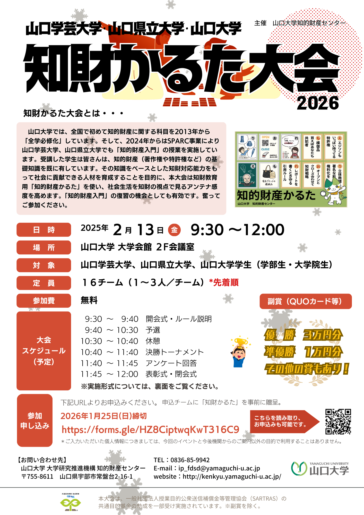 | 内容 | ◆◇◆山口学芸大学、山口県立大学、山口大学『知財かるた大会2026』◆◇◆ 知財かるた大会とは・・・ 山口大学では、全国で初めて知的財産に関する科目を2013年から「全学必修化」しています。そして、2024年からはSPARC事業により山口学芸大学、山口県立大学でも「知的財産入門」の授業を実施しています。受講した学生は皆さんは、知的財産(著作権や特許権など)の基礎知識を既に有しています。その知識をベースとした知財対応能力をもって社会に貢献できる人材を育成することを目的に、本大会は知財教育用「知的財産かるた」を使い、社会生活を知財の視点で見るアンテナ感度を高めます。「知的財産入門」の復習の機会としても有効です。奮ってご参加ください。