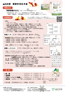 ●日 時 2026年2月13日(金)9:30~ 12:00 ●場 所 山口大学 大学会館 2F会議室 ●対 象 山口学芸大学、山口県立大学、山口大学学生(学部生・大学院生) ●定 員 16チーム(1~3人/チーム) ※先着順 ●参 加 費 無料 (事前練習用「かるた&解説本」を進呈してます!) ●副賞(QUOカード等) 優勝:3万円分、準優勝:1万円分、その他『楽しい賞』あり!