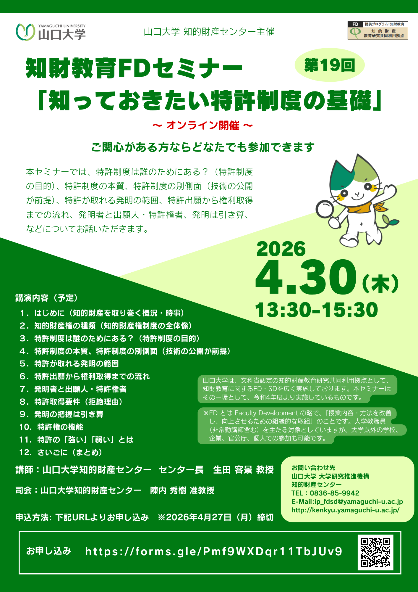 | 資料等 | 20260430_第19回知財教育FDセミナーチラシ |