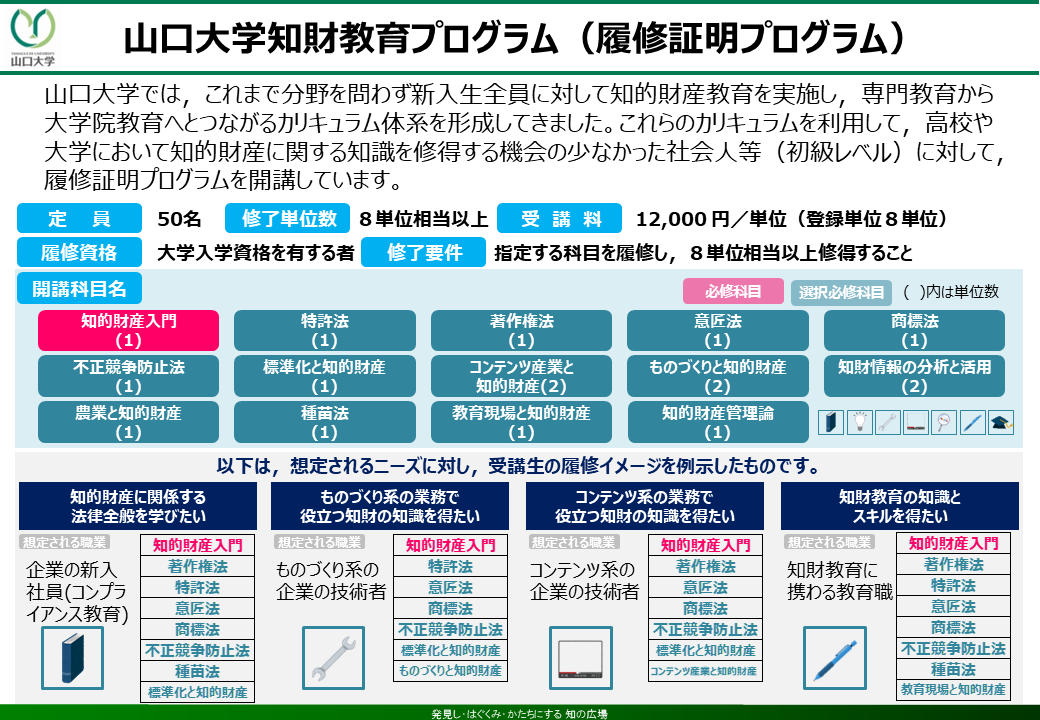 本プログラムは,企業において知的財産(技術,ブランド等)を活用して効果的にビジネス展開に結び付けることのできる人材育成や知的財産教育に携わる人材育成,