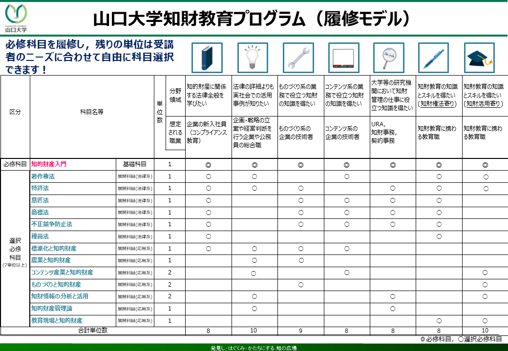 著作権法(1単位) ・・・基本オンライン受講、2日間(土・日)の集中講義 意匠法(1単位) ・・・基本オンライン受講、2日間(土・日)の集中講義 特許法(1単位) ・・・基本オンライン受講、2日間(土・日)の集中講義 商標法(1単位) ・・・基本オンライン受講、2日間(土・日)の集中講義 不正競争防止法(1単位) ・・・基本オンライン受講、2日間(土・日)の集中講義 種苗法(1単位) ・・・基本オンライン受講、2日間(土・日)の集中講義 標準化と知的財産(1単位) ・・・基本オンライン受講、2日間(土・日)の集中講義 農業と知的財産(1単位) ・・・基本オンライン受講、2日間(土・日)の集中講義 コンテンツ産業と知的財産(2単位) ・・・基本オンライン受講、4日間(土・日)の集中講義 ものづくりと知的財産(2単位) ・・・基本オンライン受講、4日間(土・日)の集中講義 知的財産管理論(1単位) ・・・基本オンライン受講、2日間(土・日)の集中講義 教育現場と知的財産(1単位) ・・・基本オンライン受講、2日間(土・日)の集中講義 知財情報の分析と活用(2単位) ・・・同内容にて常盤・吉田キャンパスで2回対面開講するためどちらを受講してもよい(e-learningも可能)。 |